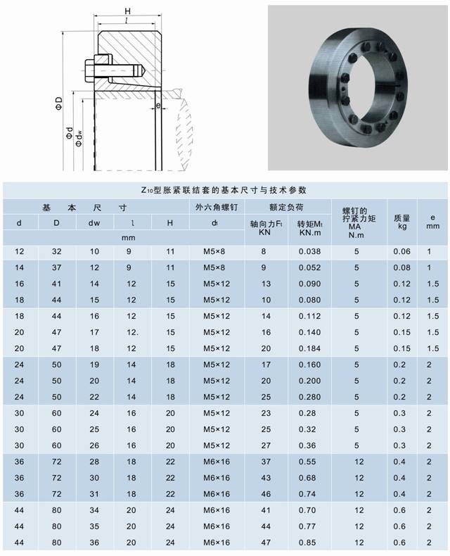 脹緊聯(lián)結(jié)套是一種近代新型Xian進(jìn)的機(jī)械基礎(chǔ)件。脹套是當(dāng)今 廣泛用于實(shí)現(xiàn)機(jī)件和軸聯(lián)結(jié),靠擰緊12.9級高強(qiáng)度螺釘使包容面間產(chǎn)生的壓力和摩擦力來實(shí)現(xiàn)負(fù)荷傳遞的一種新型無鍵聯(lián)結(jié)裝置。 脹套這與一般過盈聯(lián)結(jié)、有鍵聯(lián)結(jié)相比,脹套聯(lián)結(jié)具有許多 的優(yōu)點(diǎn)。